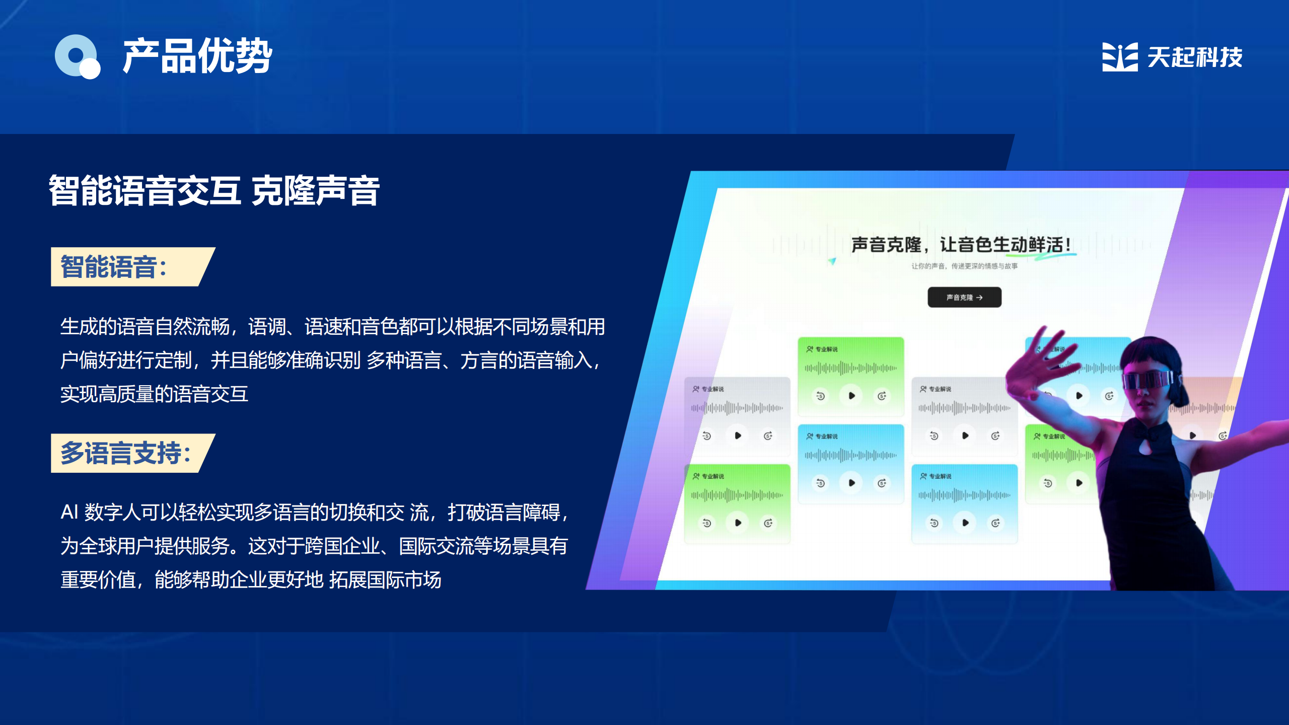 天起AI声音克隆还可以轻松实现多语言的切换和交流,打破语言障碍,为全球用户提供服务。这对于跨国企业、国际交流等场景具有重要价值,能够帮助企业更好地拓展国际市场。