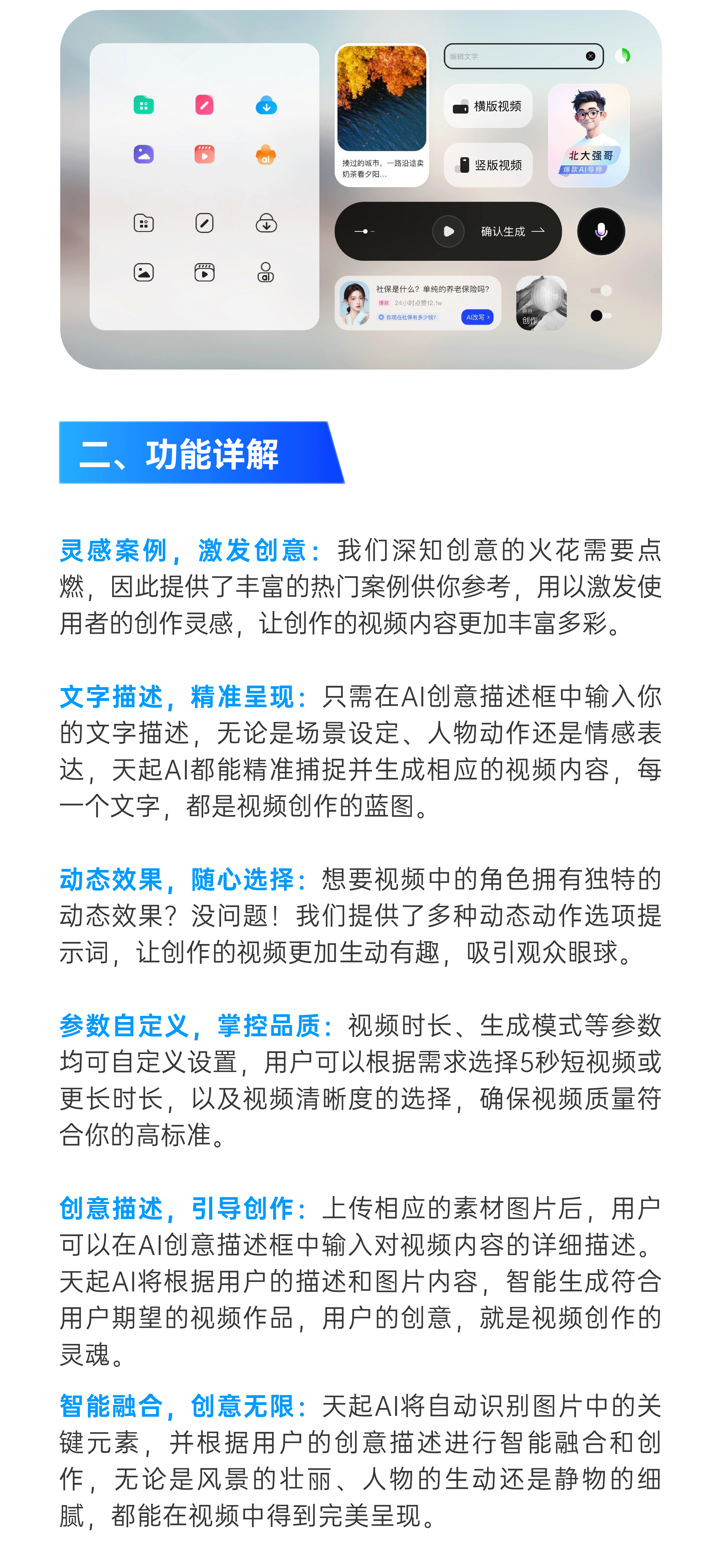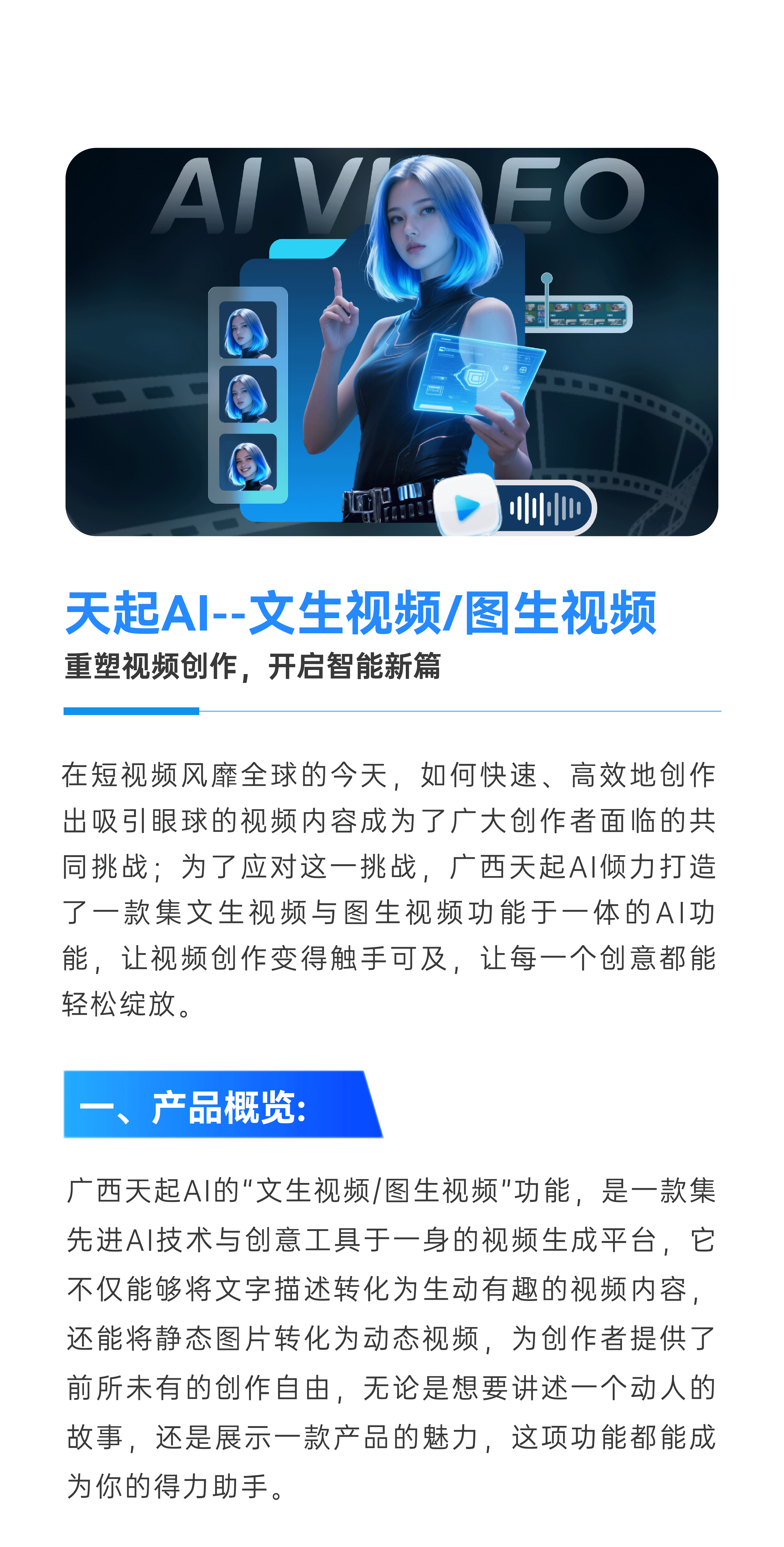 在短视频风靡全球的今天,如何快速、高效地创作出吸引眼球的视频内容成为了广大创作者面临的共同挑战;为了应对这一挑战,广西天起AI倾力打造了一款集文生视频与图生视频功能于一体的AI功能,让视频创作变得触手可及,让每一个创意都能轻松绽放。