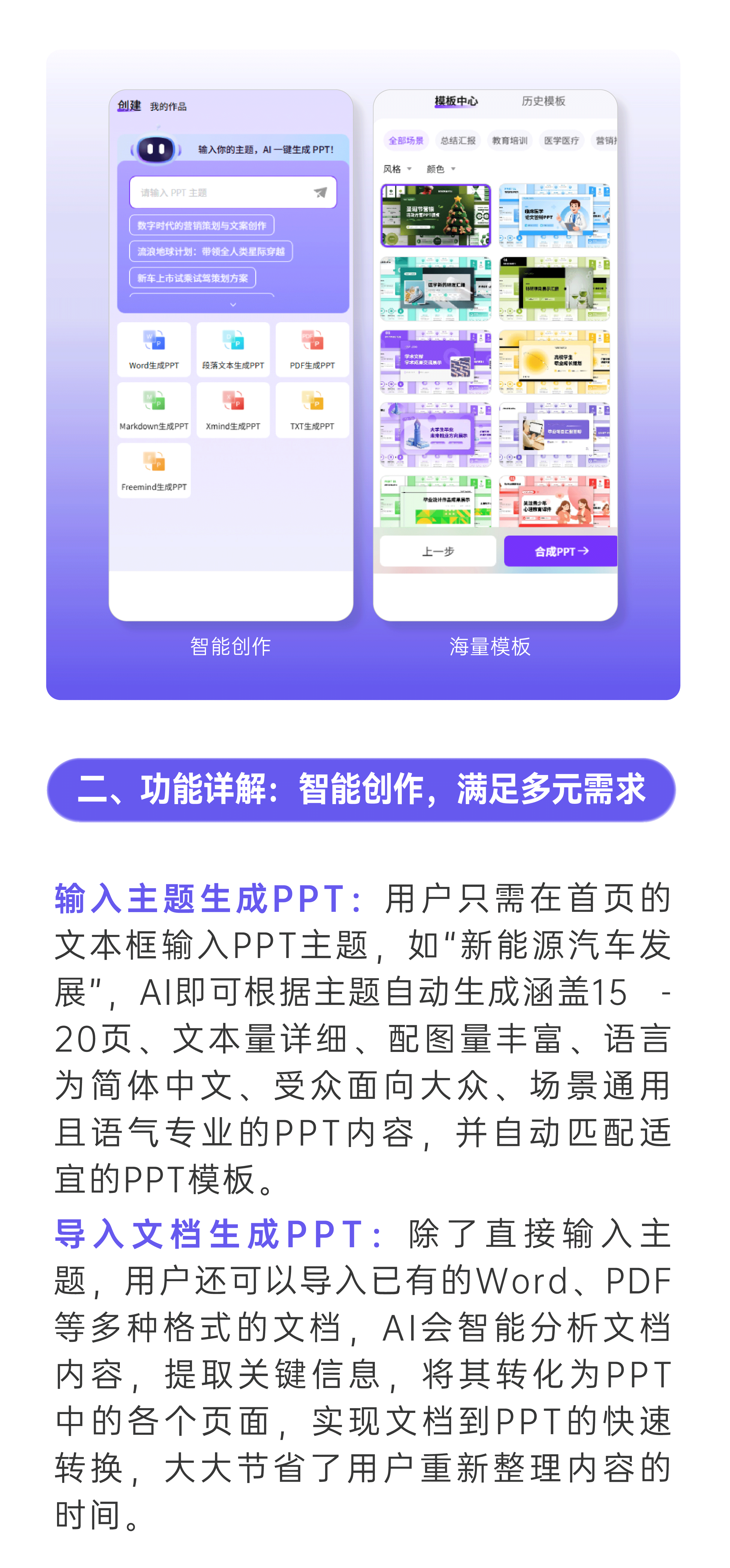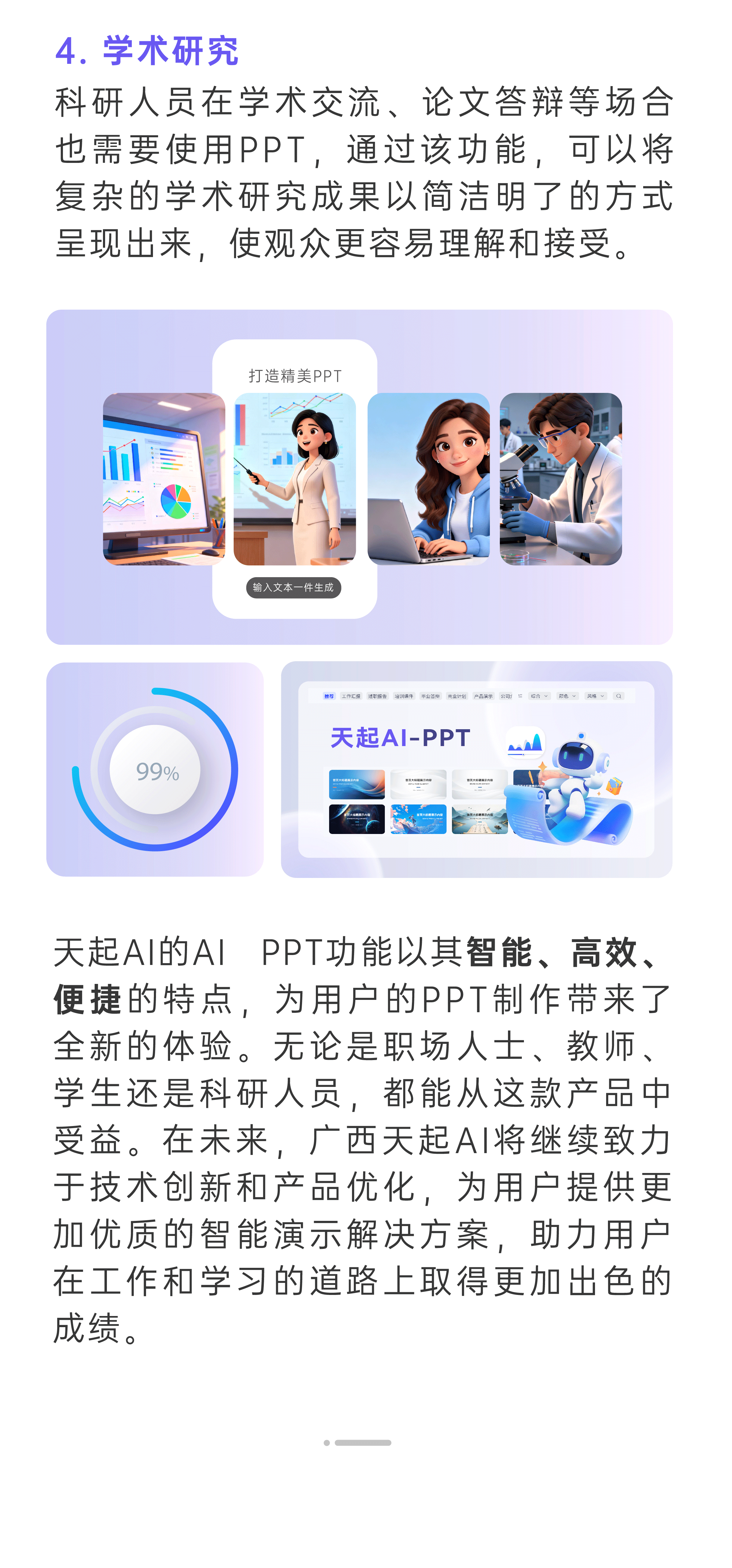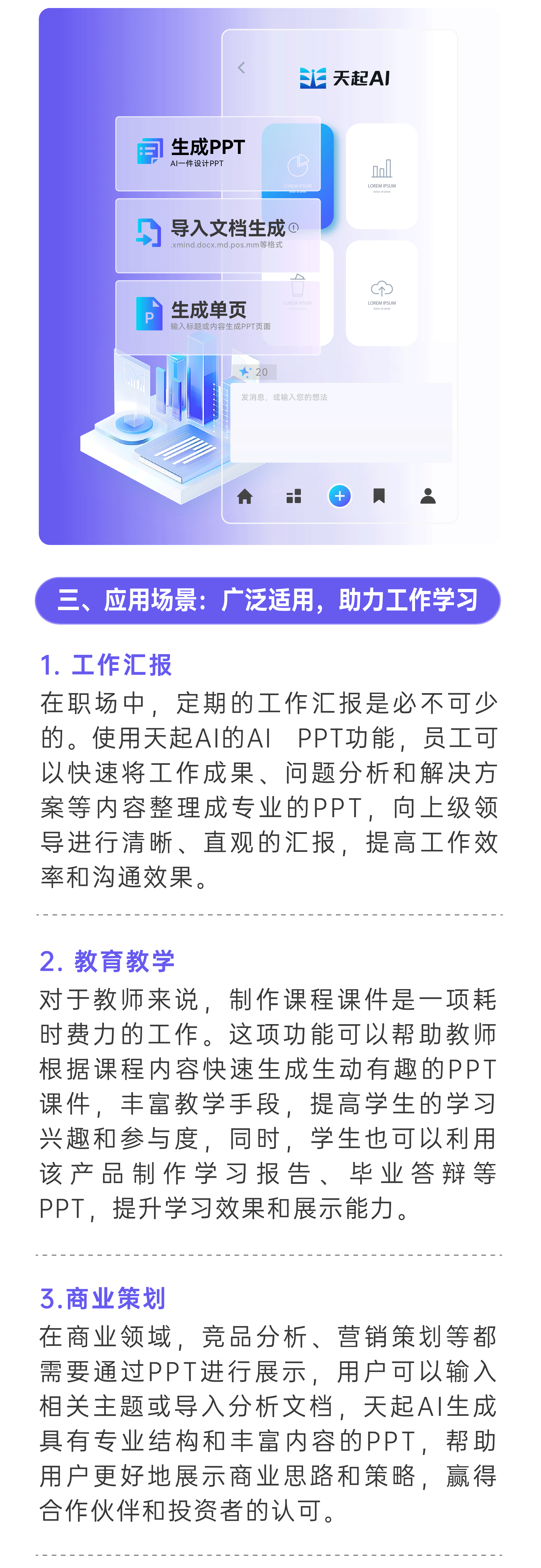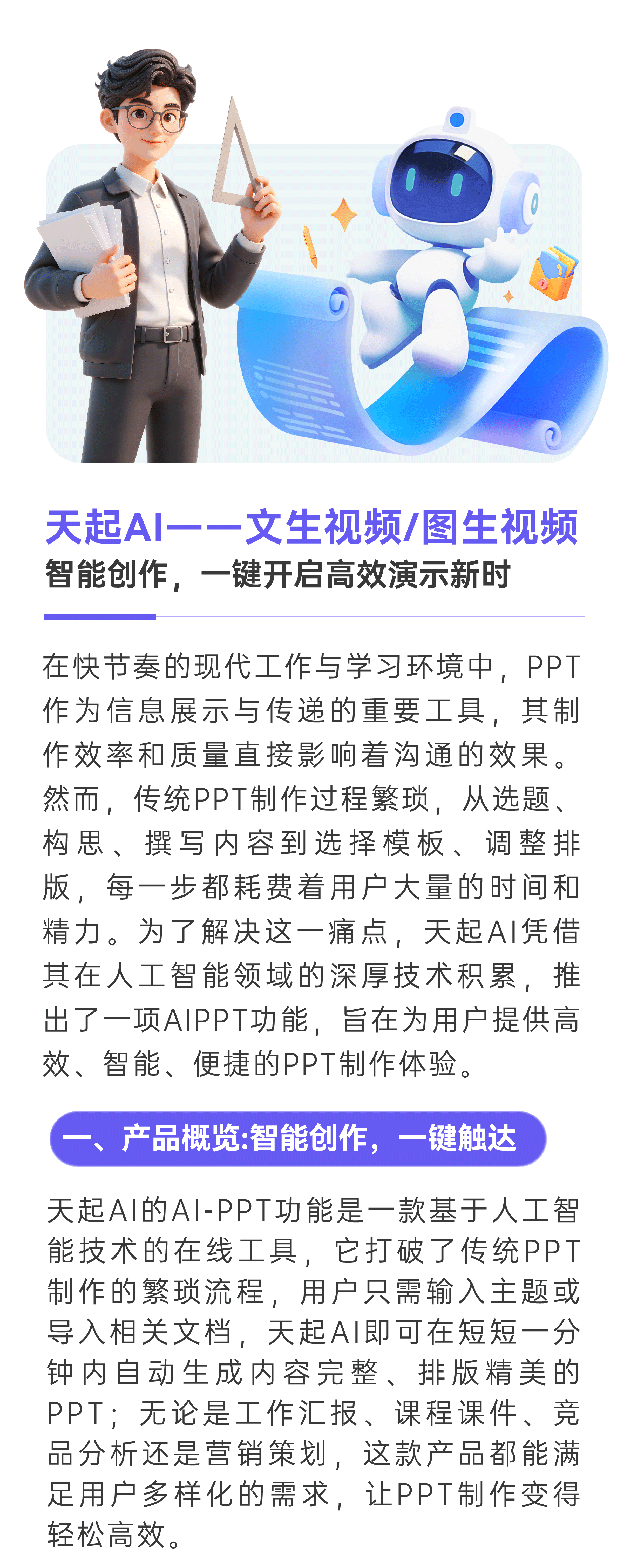 在快节奏的现代工作与学习环境中,PPT作为信息展示与传递的重要工具,其制作效率和质量直接影响着沟通的效果。然而,传统PPT制作过程繁琐,从选题、构思、撰写内容到选择模板、调整排版,每一步都耗费着用户大量的时间和精力。为了解决这一痛点,天起AI凭借其在人工智能领域的深厚技术积累,推出了一项AIPPT功能,旨在为用户提供高效、智能、便捷的PPT制作体验。