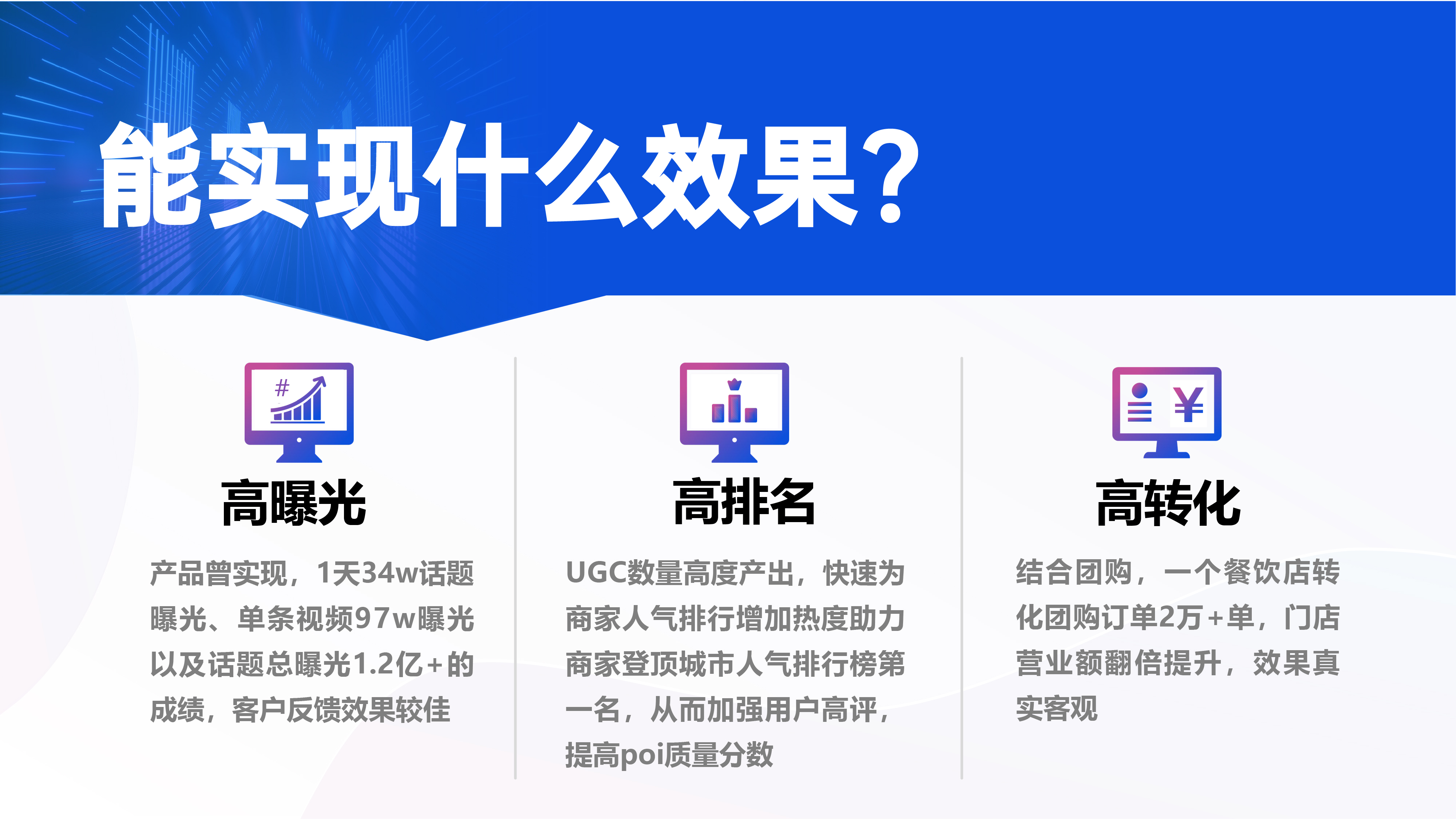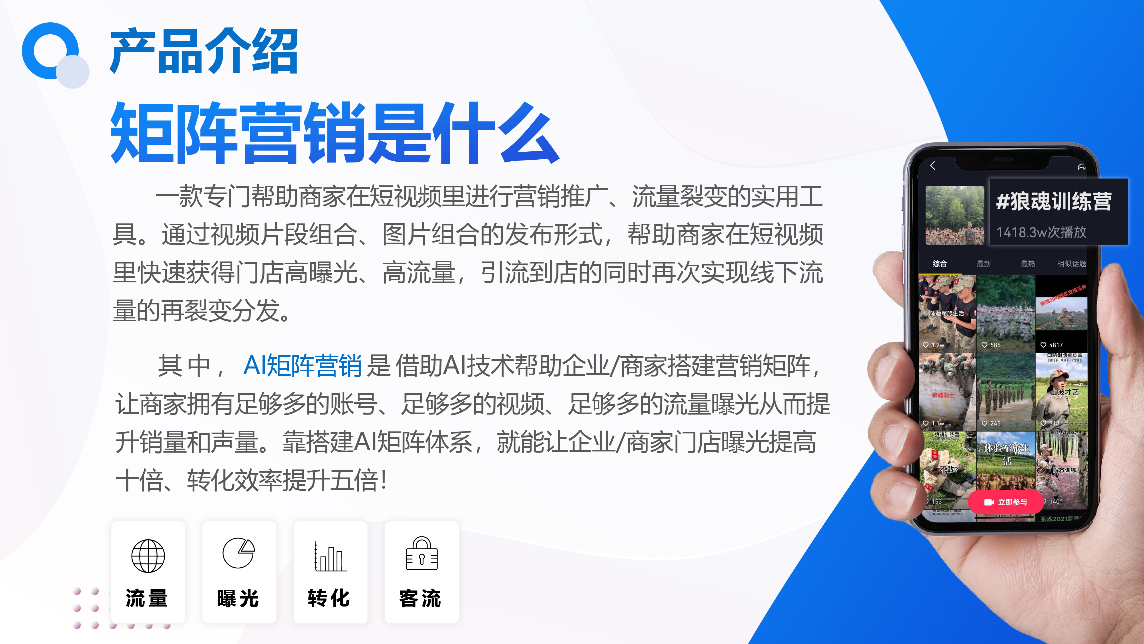 AI技术助力本地生活运营者打造低成本流量矩阵,让商家门店快速获得高曝光、高流量、高转化,线上引流到店的同时还能实现线下流量的再裂变和分发
